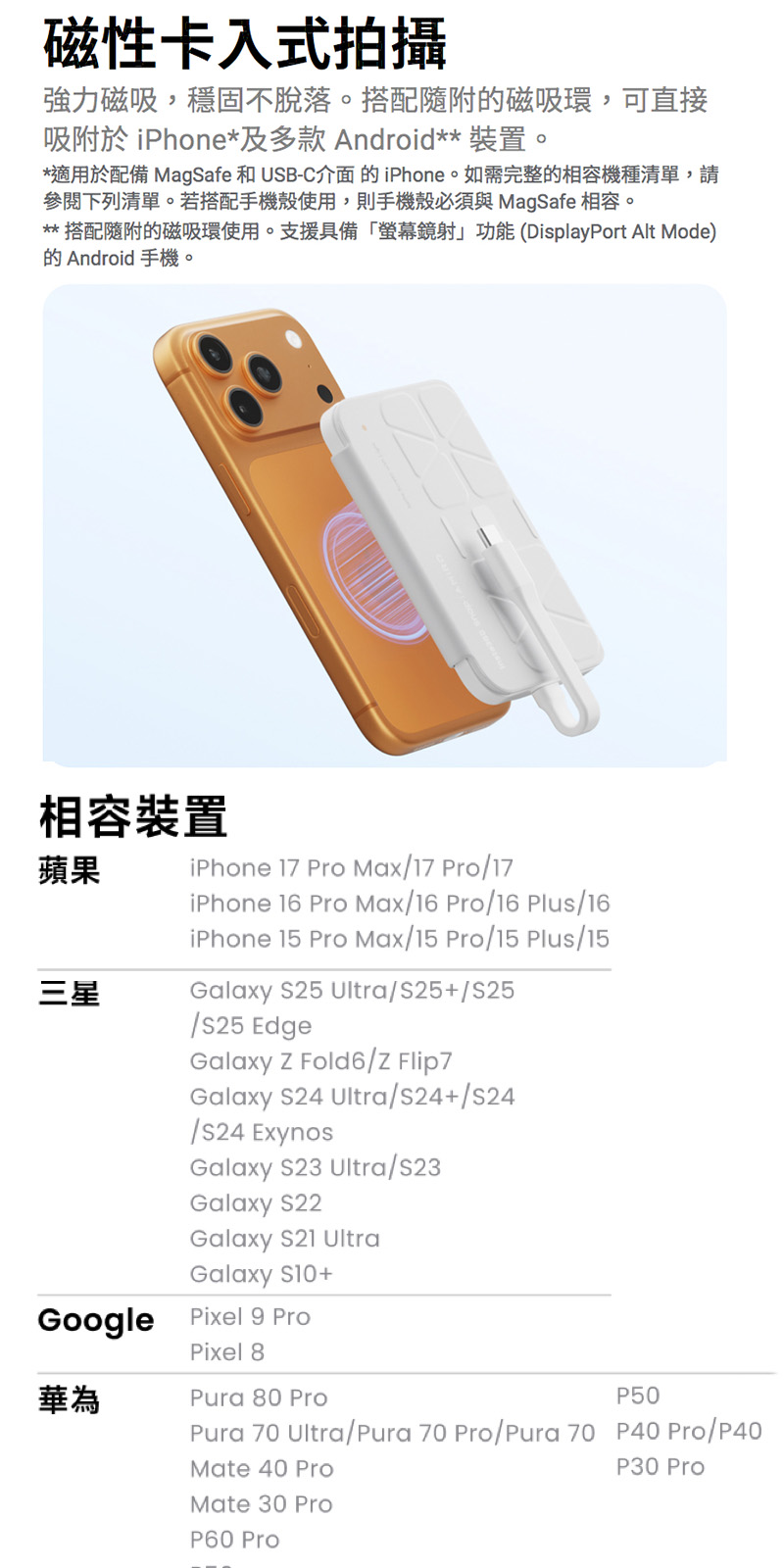 • 專為具備 USB-C 介面的 iPhone 及 Android 手機設計。支援型號請參閱下方的相容性列表。