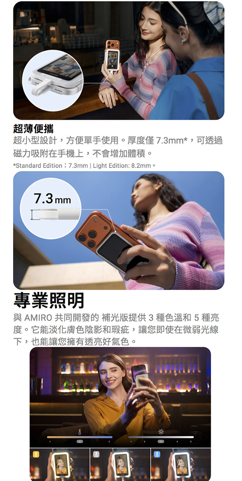 • 補光版與美容科技專家 AMIRO 共同研發,提供 3 種色溫和 5 種亮度等級,讓您即使在微弱光線下,也能讓您擁有透亮好氣色。
