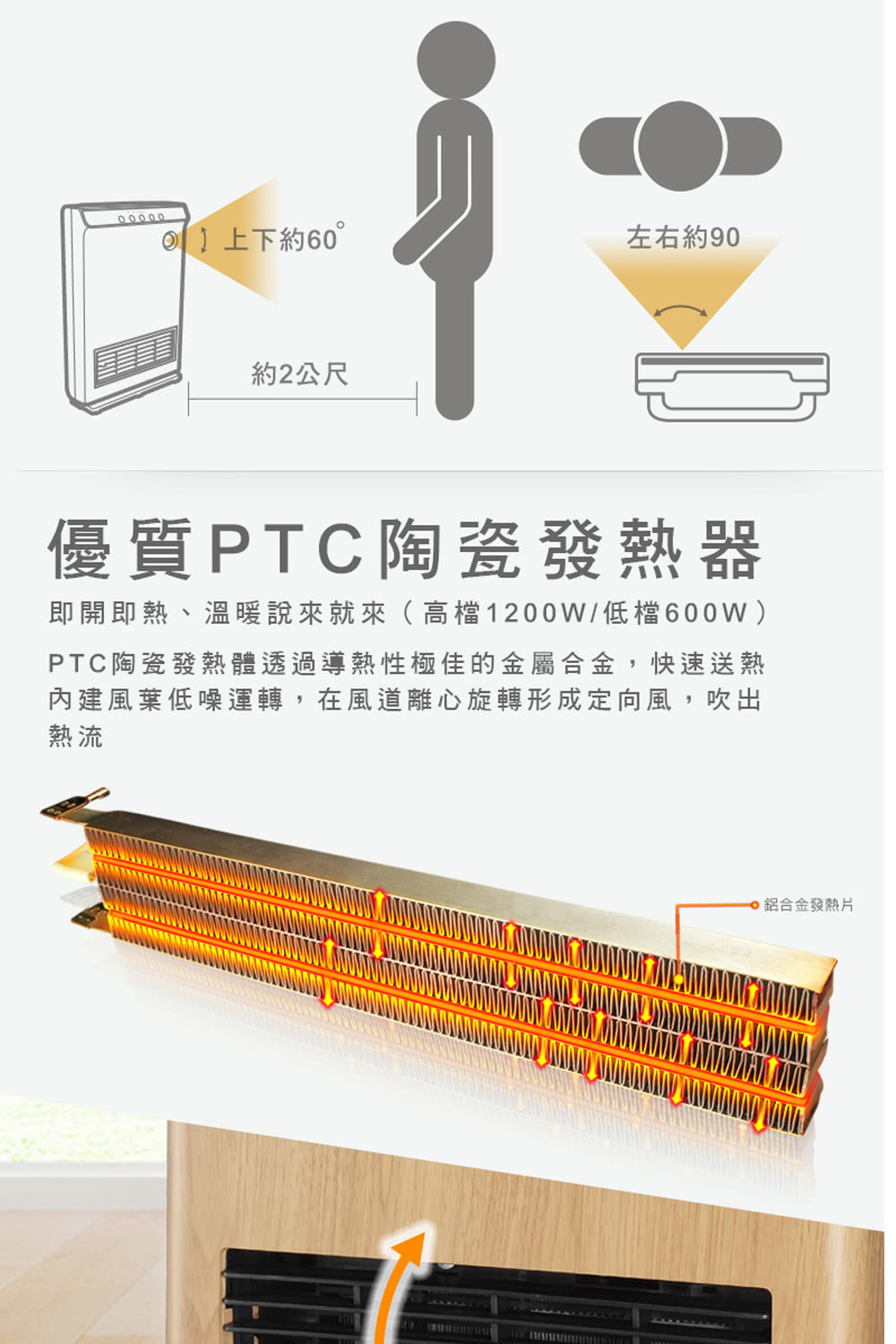 • PTC陶瓷發熱、即開即熱、溫暖說來就來(高檔1200W/低檔600W)